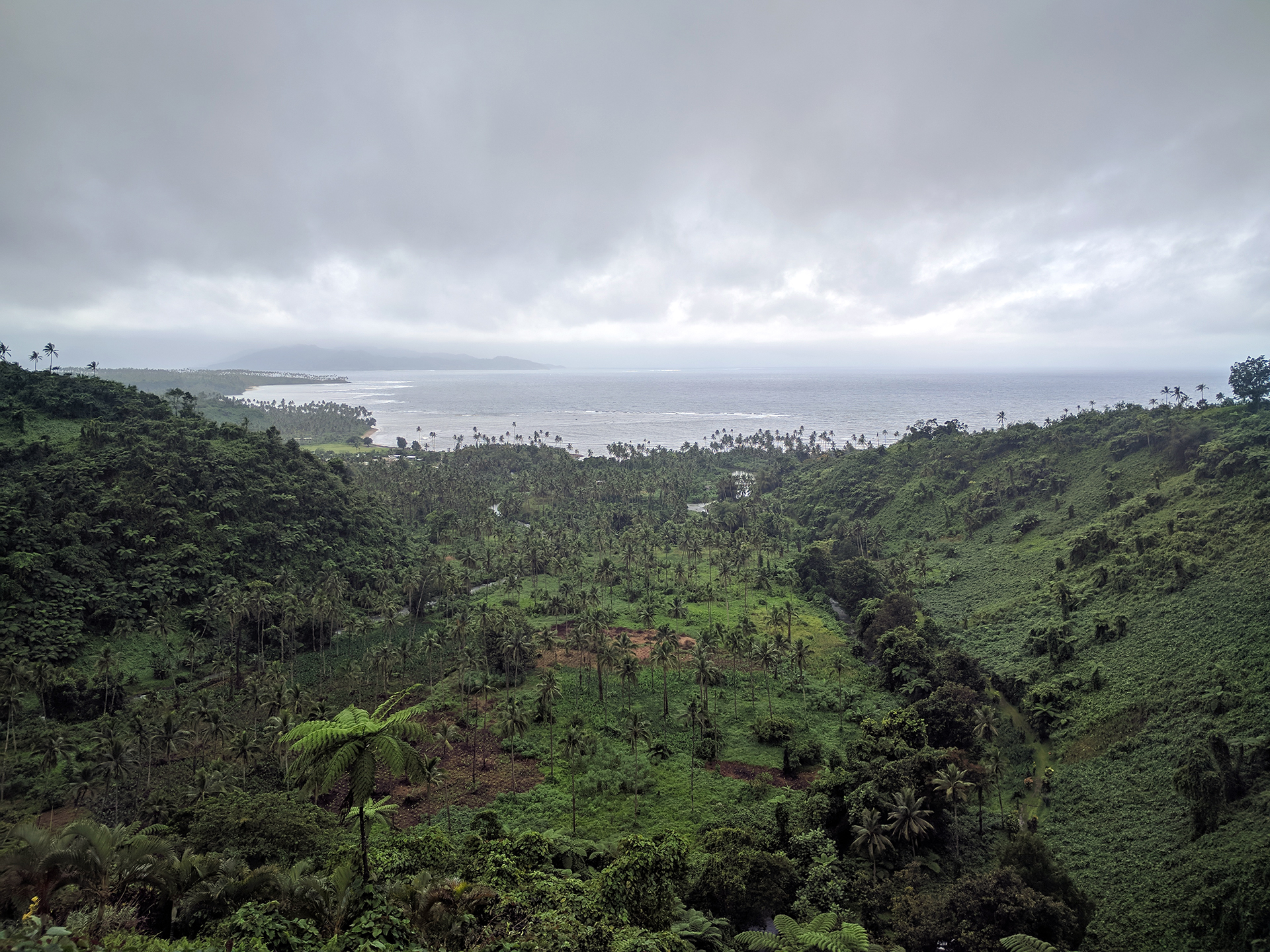 Die Schätze, welche Fidschi über Wasser zu bieten hat, sind mindestens so prunkvoll, wie diejenigen unter Wasser. Denn das Land bietet so ziemlich alles von der kleinen, von Kokospalmen gesäumten Sandinsel hin bis zur grossen und hügeligen Insel vulkanischen Ursprungs mit Urwald. Besonders bemerkenswert ist dabei die Vegetation. Ich habe insgesamt zwar nur einen kleinen Teil von Fidschi gesehen, die „Garteninsel“ Taveuni war bezüglich Vegetation jedoch unglaublich und wohl der grünste und feuchteste Fleck der Erde, den ich je betreten habe. Hier der Blick runter zum Meer von einem Aussichtspunkt auf dem Weg zu ein paar Wasserfällen: